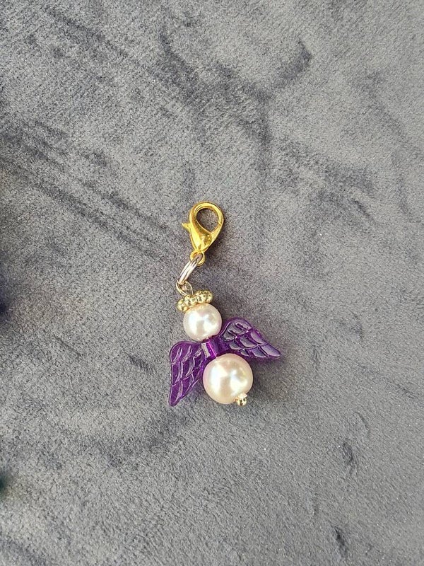 Denna lyckoängel har lila vingar och både huvud och kropp i vita pärlemor-pärlor. Kronan och själva låset är guldfärgade.