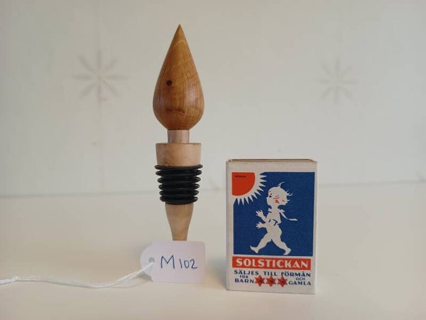 Flaskstopp av äppelträ som är svarvad och slutligen är nederdelen behandlad flertalet gånger med livsmedelssäkert friktionsvax.