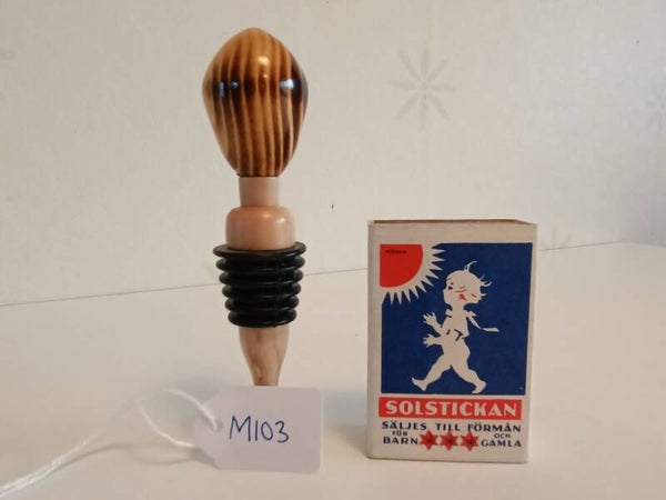Flaskstopp av äppelträ som är svarvad och slutligen är nederdelen behandlad flertalet gånger med livsmedelssäkert friktionsvax.