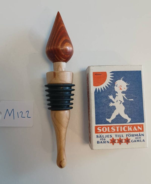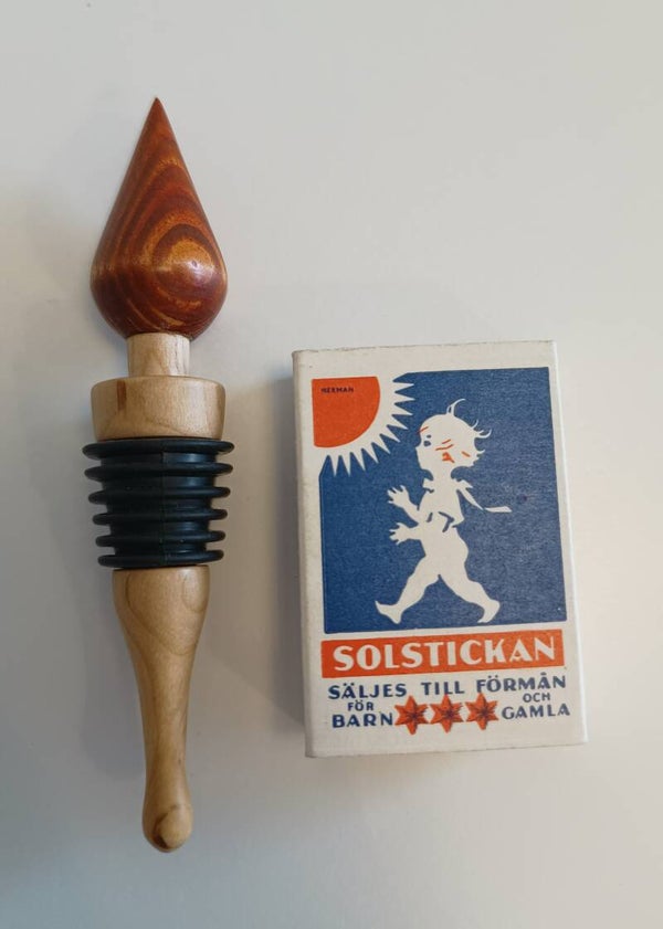Flaskstopp av äppelträ med topp av furu som är svarvad och slutligen behandlad flertalet gånger med livsmedelssäkert friktionsvax.