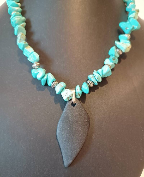 Ett lyxigt halsband med turkos-stenar. och ett svart glashänge som har polerats av havet. Mellan turkos-stenarna är en liten tibetansk metallpärla.