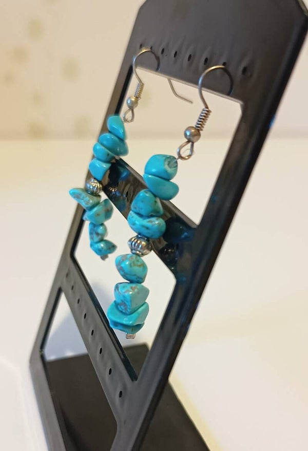 Ett par lyxiga örhängen med åtta stycken turkos stenar. Mellan turkos stenarna är en liten tibetansk metallpärla.