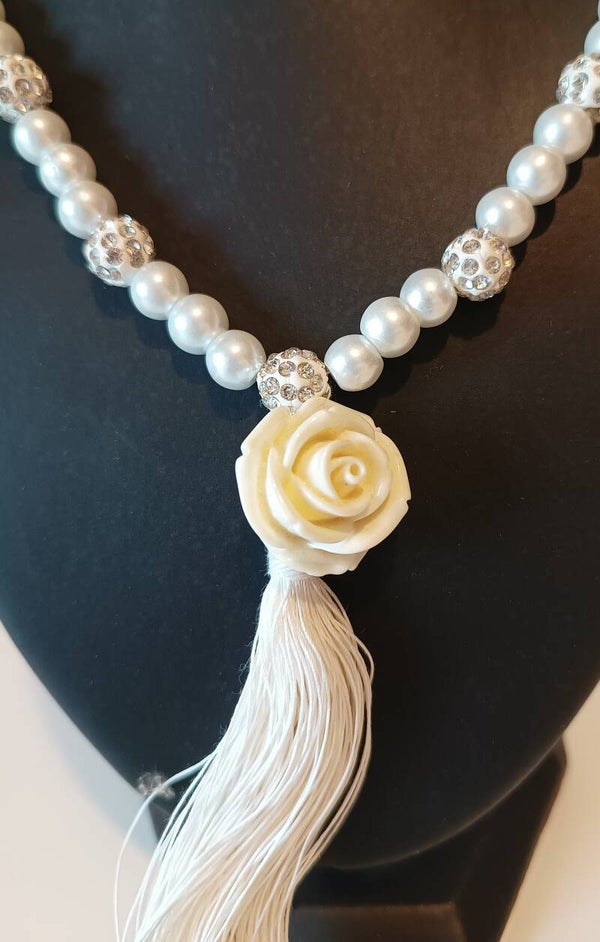 Halsbandet "White Lady" med vita pärlor och cubic zirconia stenprydda lerpärlor. Halsbandet övergår i en vit blomma med en lång vit tofs.