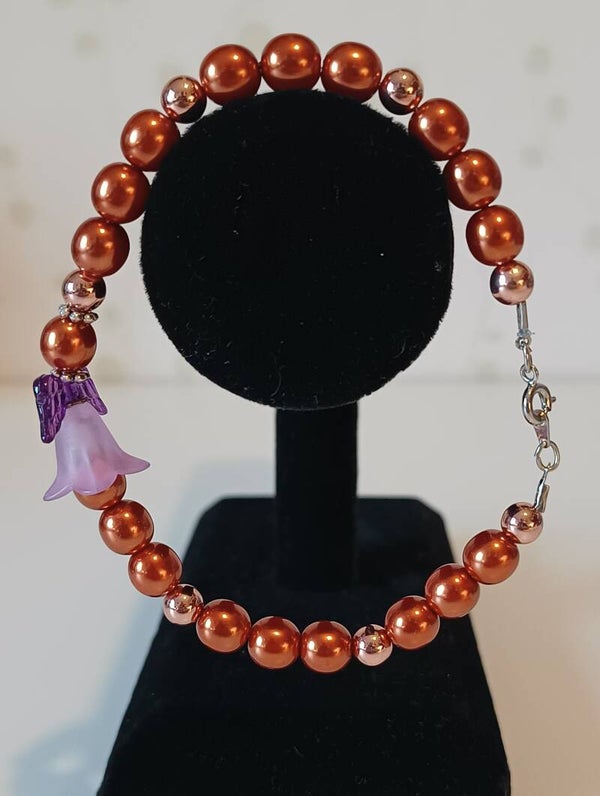 Bronze angel armbandet har en lila ängel med metallbronsfärgad pärla till huvud. Ängel sitter på mitten och är omsluten av stora och små metallbronsfärgade pärlor.