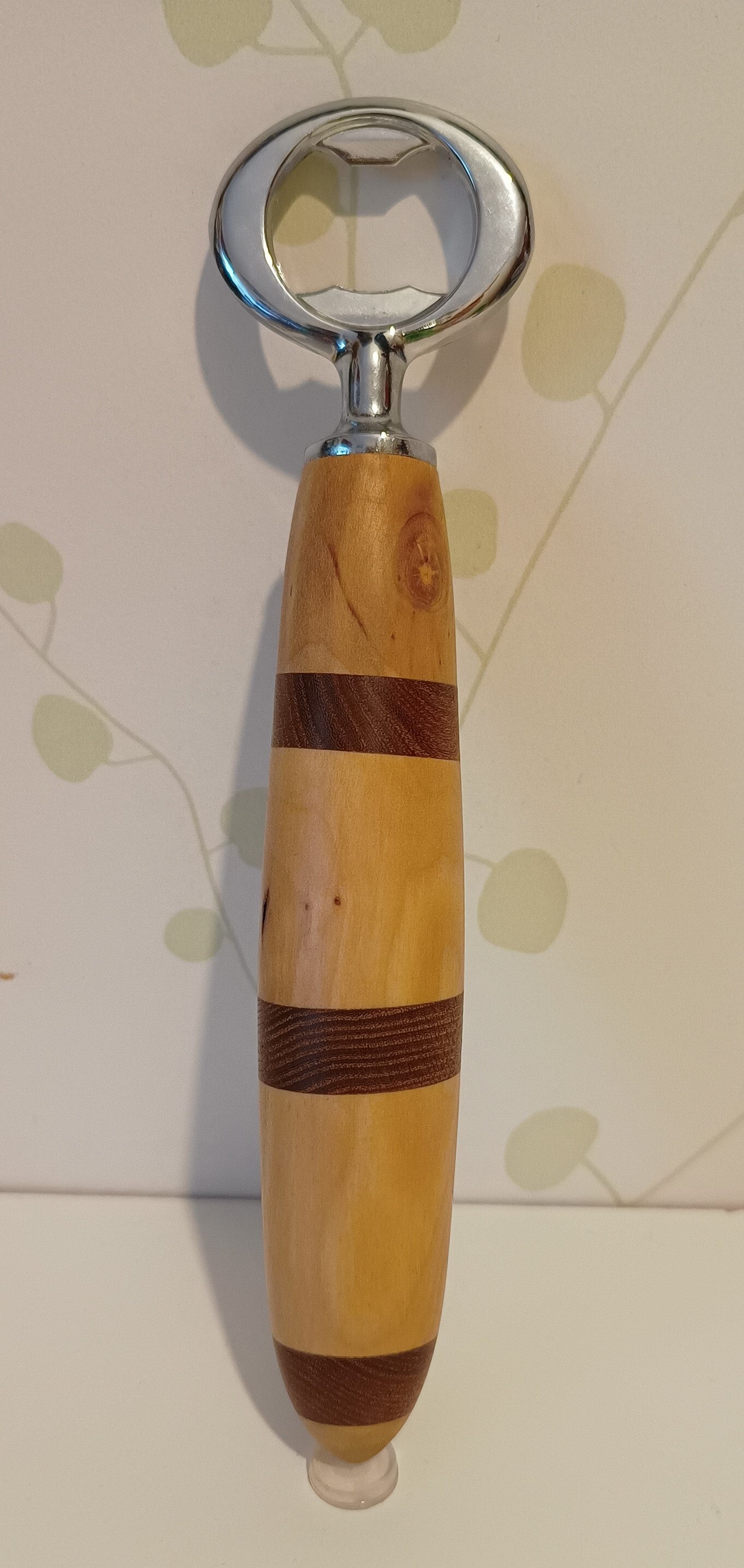 Kapsylöppnare som är gjord av äppelträ och ek, bearbetad i svarv och behandlad flertalet gånger med linolja för en silkeslen finish.