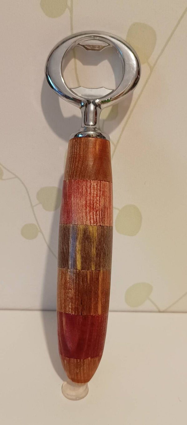 Kapsylöppnare som är gjord av furu, bearbetad i svarv, betsad och behandlad flertalet gånger med friktionsvax.