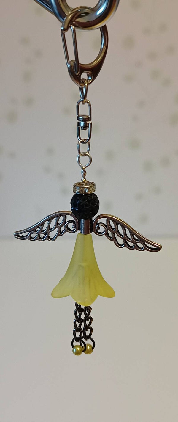 Denna lyckoängel har silverfärgade vingar med ornament och huvudet är en svart pärla med glänsande stenar. Ängeln har en stor gul klänning och två matchande pärlor som fötter.